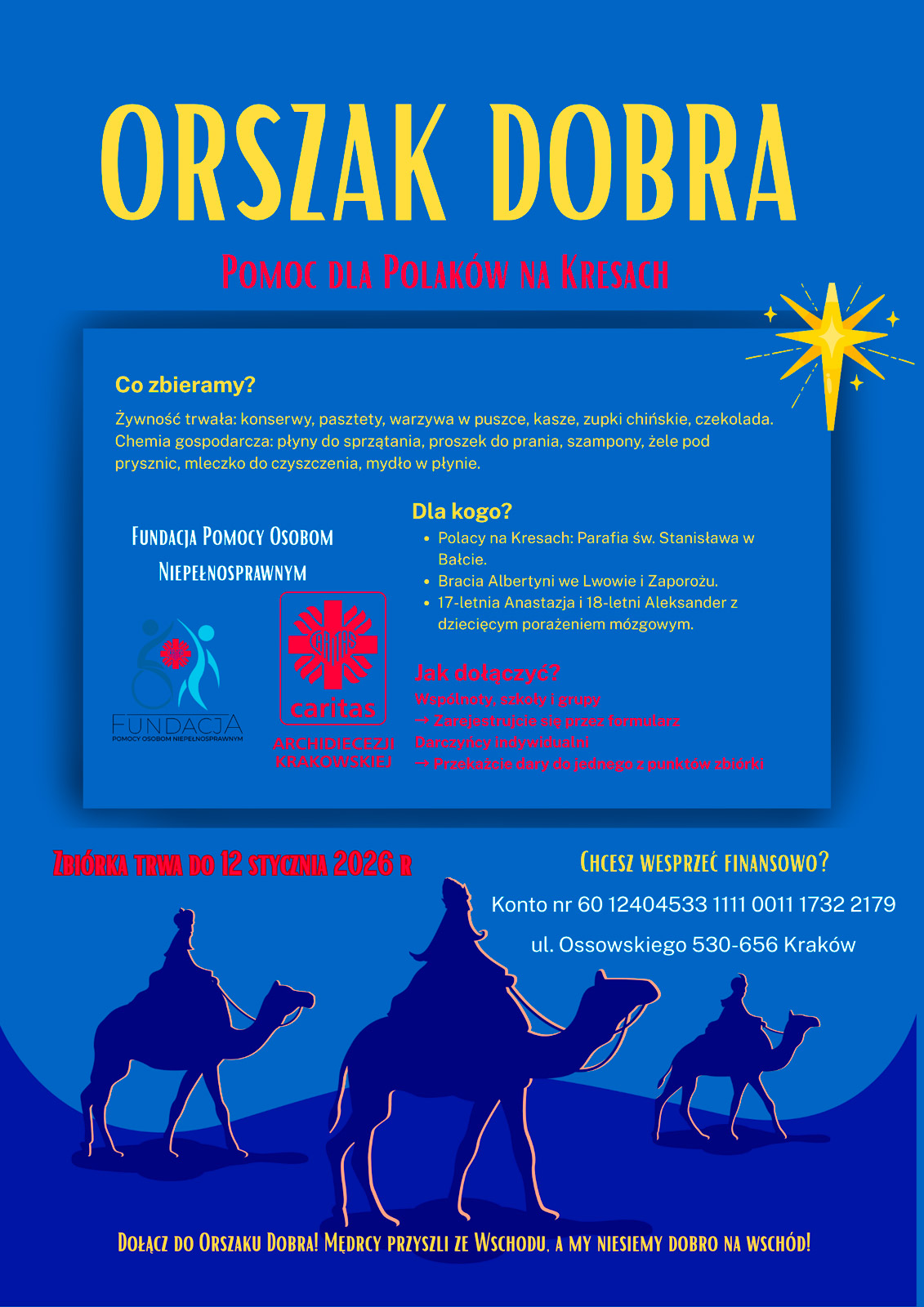 Dołącz do Orszaku Dobra – razem niesiemy światło na Wschód! Drodzy Przyjaciele, dziś zapraszamy Was do wyjątkowej akcji, która łączy serca, przekracza granice i niesie pomoc tam, gdzie jej naprawdę brakuje. Caritas Archidiecezji Krakowskiej oraz Fundacja Pomocy Osobom Niepełnosprawnym w Stróżach zapraszają szkoły, parafie, wspólnoty i wszystkich ludzi dobrej woli do udziału w Orszaku Dobra – wielkiej zbiórce dla Polaków żyjących na Kresach Wschodnich oraz organizacji wspierających Polaków na Ukrainie.