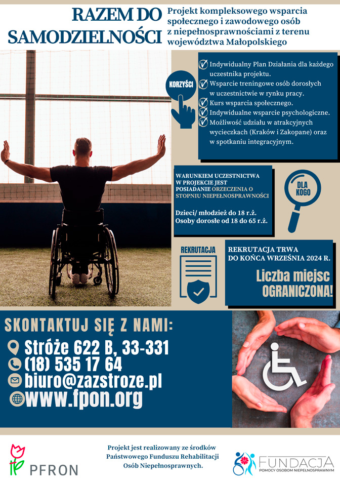 CEL PROJEKTU: Kompleksowe wsparcie społeczne i zawodowe osób z niepełnosprawnościami z terenu województwa Małopolskiego.